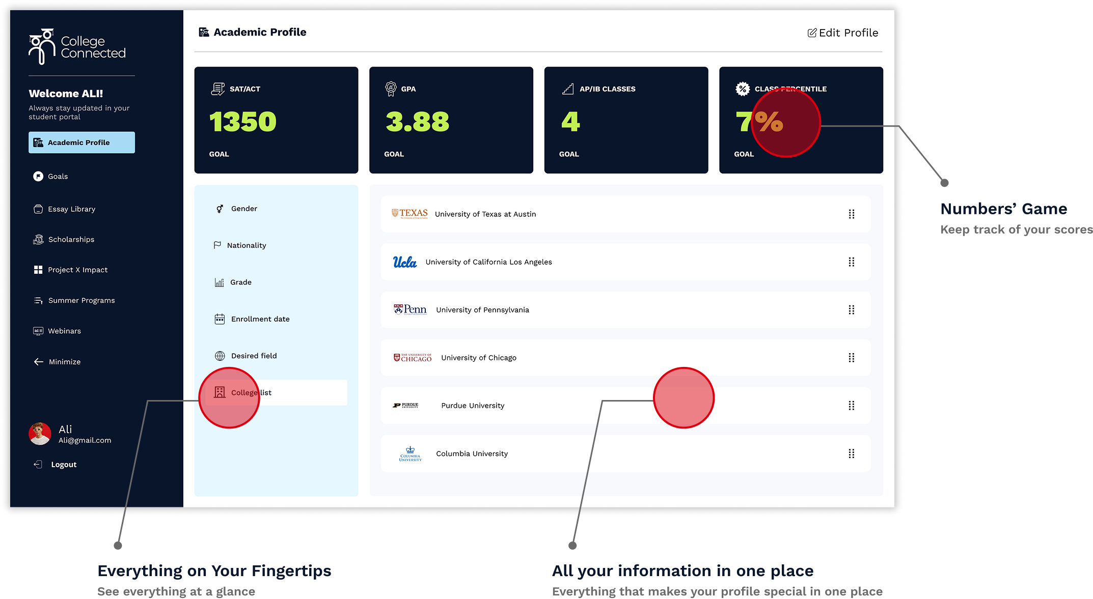 College Connected structures programs in our proprietary student portal, enabling a structured and organized approach to every aspect of the college admissions process